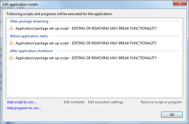 Application (or package –level) configuration scripts are pre-made scripts (in VBscript, so that they can be run silently even without using enhanced scripting options which require that .NET 2.0 runtime on the clients), which makes it even more straightforward to implement certain often-needed tasks that App-V packagers face. Some of the scripts are only applicable to individual virtual applications, some only to package level scripting (which was discussed in the first part of this series) and some can be used in both.