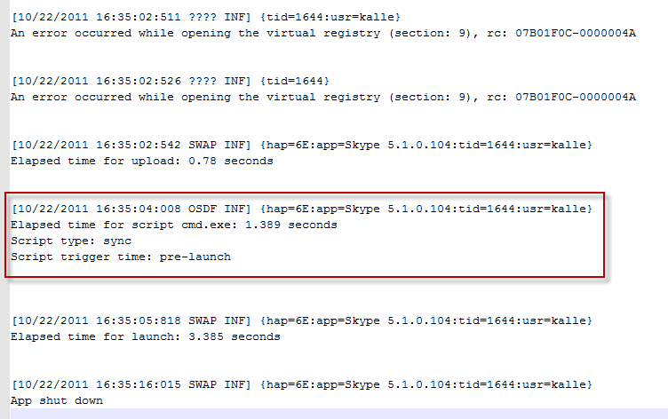 Or in case of using ABORTRESULT, nothing is showed at all but launch is silently aborted, which is interesting behaviour difference in itself. The App-V Client log file shows no mention of my script (cmd.exe) at all: